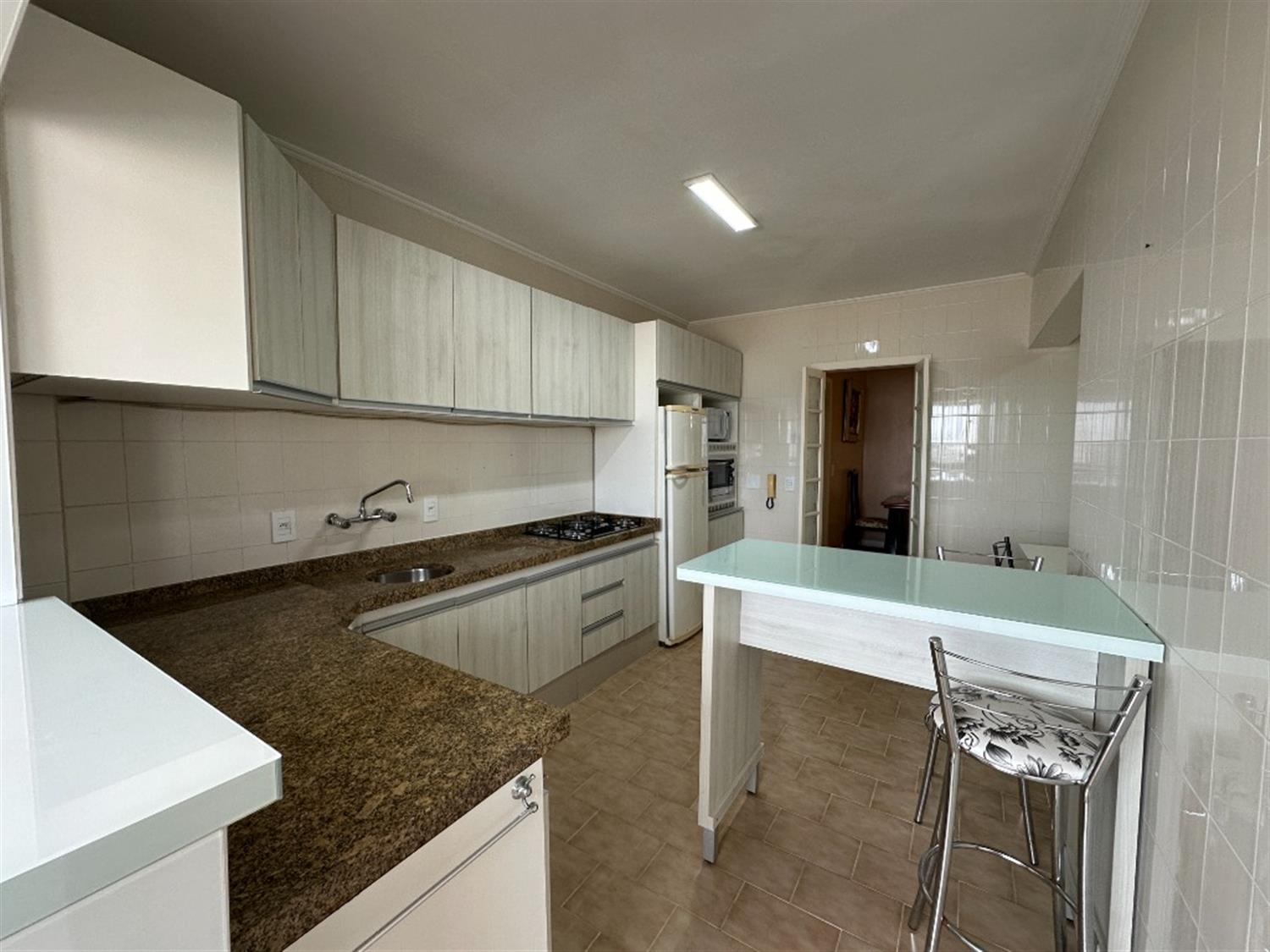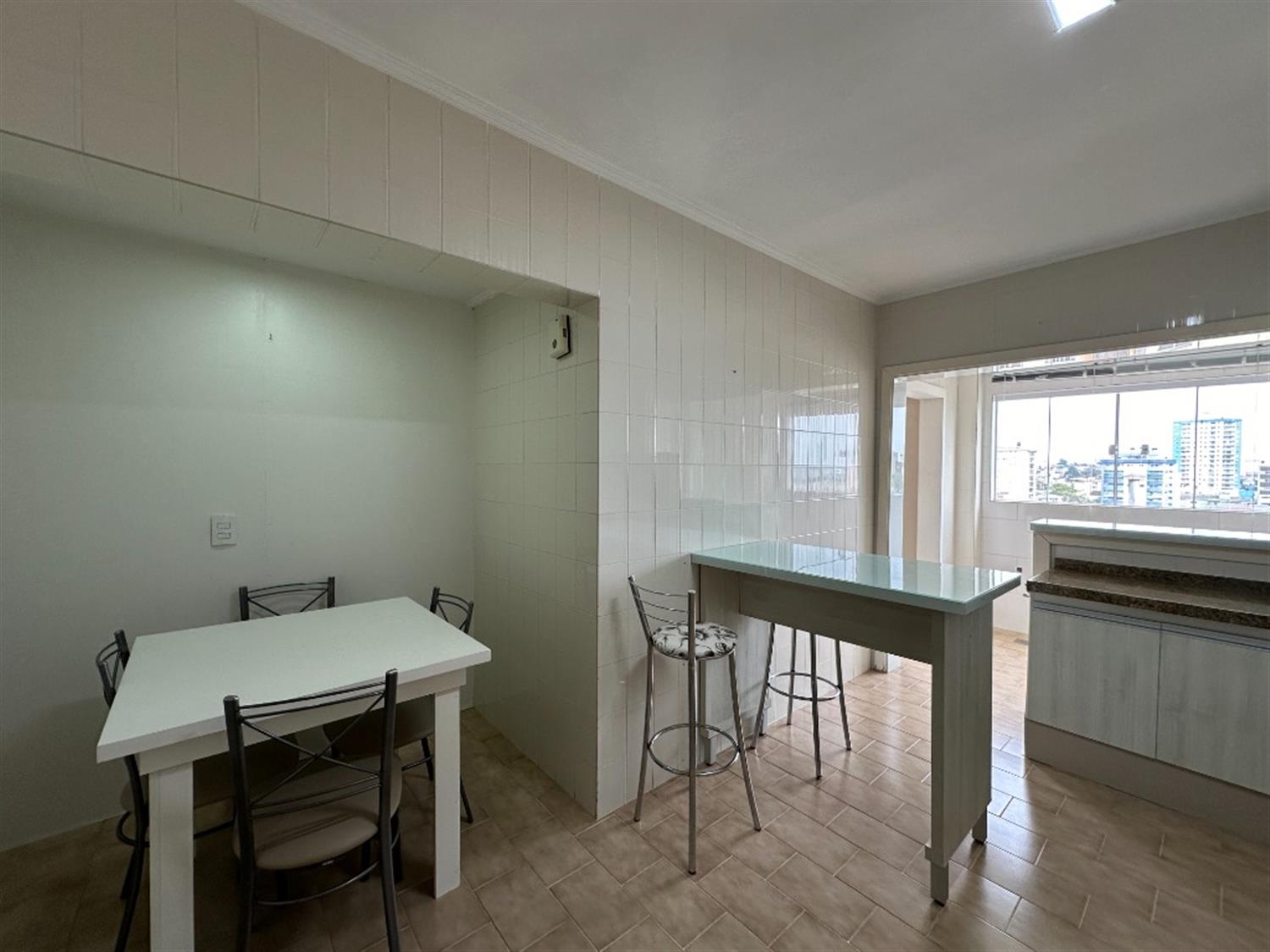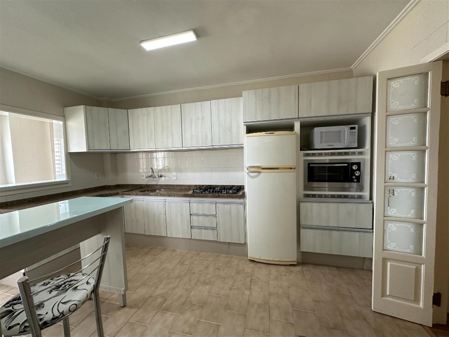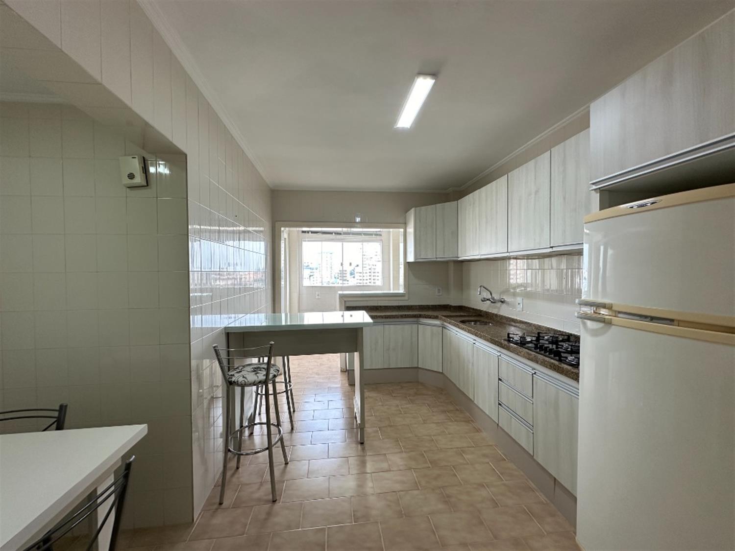 - Cozinha com mesa, bancada, armários, geladeira