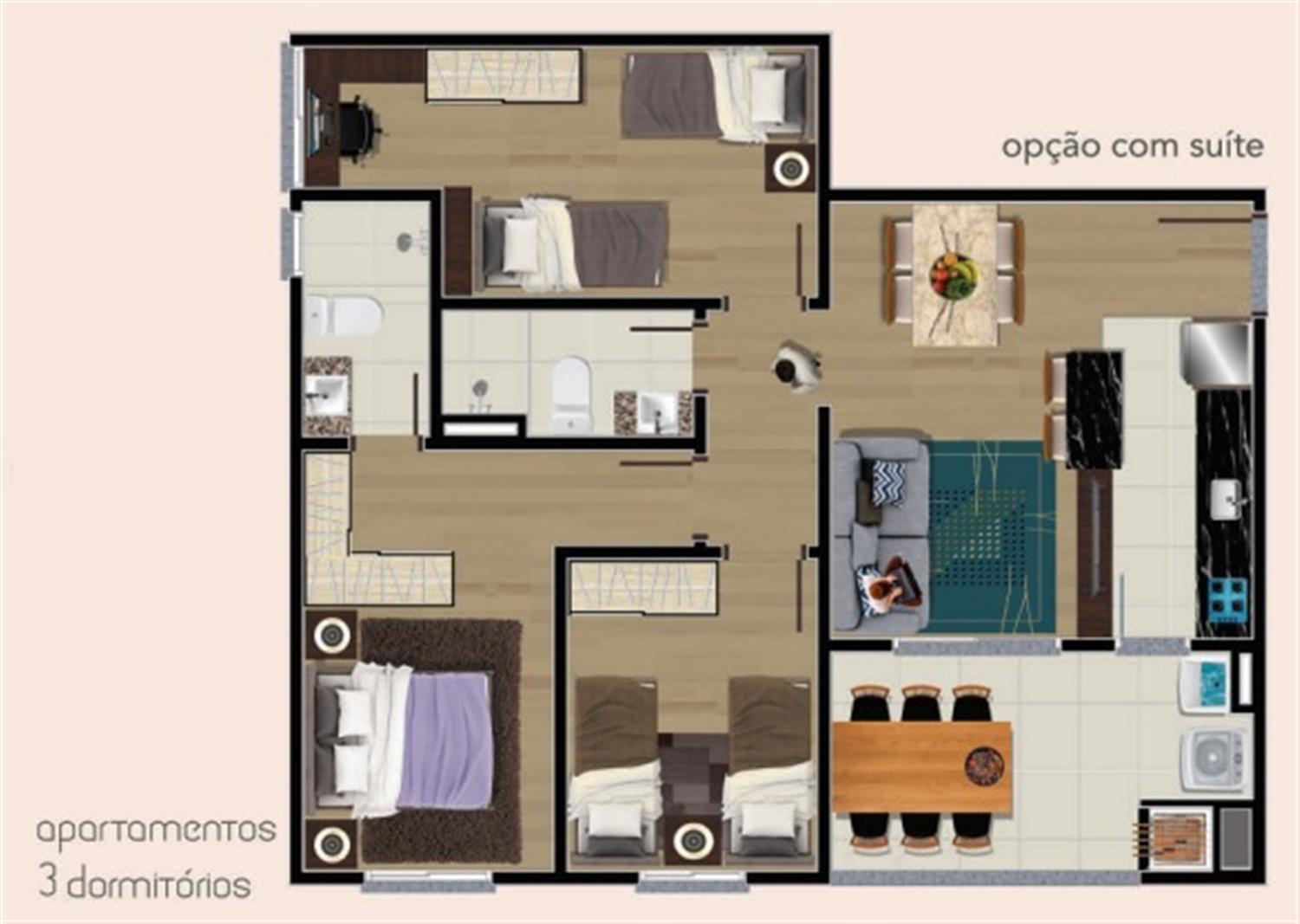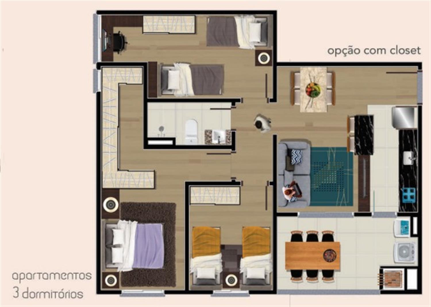 - 3 dormitórios sendo 1 com opção de suíte ou closet;